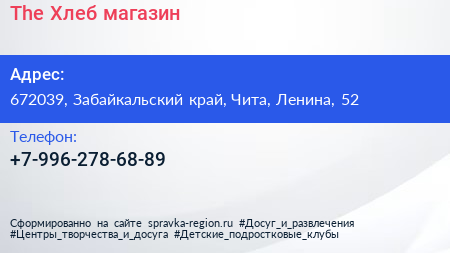 The Хлеб, магазин по адресу 672039, Забайкальский край, Чита, Ленина, 52 в дальнейшем Организация, размещена в следующих категориях: