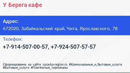У Берега, кафе по адресу 672020, Забайкальский край, Чита, Ярославского, 78 в дальнейшем Организация, размещена в следующих категориях: