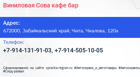 Виниловая Сова, кафе-бар по адресу 672000, Забайкальский край, Чита, Чкалова, 120а в дальнейшем Организация, размещена в следующих категориях: