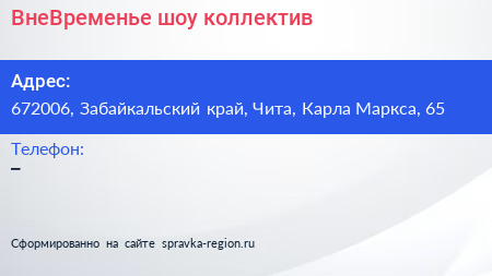 ВнеВременье, шоу-коллектив по адресу 672006, Забайкальский край, Чита, Карла Маркса, 65 в дальнейшем Организация, размещена в следующих категориях: