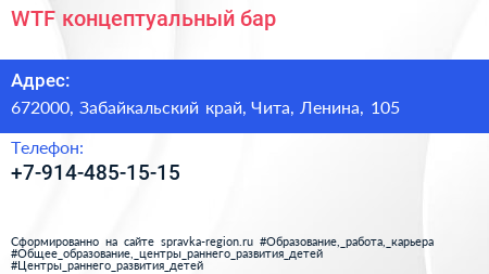 WTF, концептуальный бар по адресу 672000, Забайкальский край, Чита, Ленина, 105 в дальнейшем Организация, размещена в следующих категориях:
