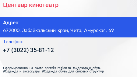 Центавр, кинотеатр по адресу 672000, Забайкальский край, Чита, Амурская, 69 в дальнейшем Организация, размещена в следующих категориях: