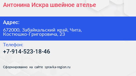 Антонина-Искра, швейное ателье по адресу 672000, Забайкальский край, Чита, Костюшко-Григоровича, 23 в дальнейшем Организация, размещена в следующих категориях: