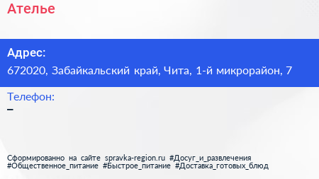 Ателье по адресу 672020, Забайкальский край, Чита, 1-й микрорайон, 7 в дальнейшем Организация, размещена в следующих категориях: