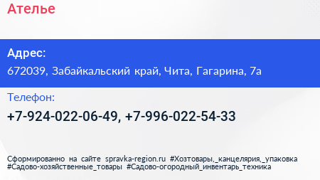 Ателье по адресу 672039, Забайкальский край, Чита, Гагарина, 7а в дальнейшем Организация, размещена в следующих категориях: