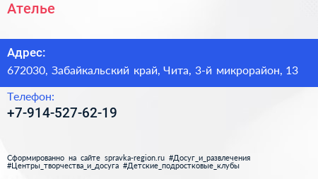 Ателье по адресу 672030, Забайкальский край, Чита, 3-й микрорайон, 13 в дальнейшем Организация, размещена в следующих категориях: