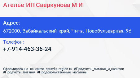 Ателье, ИП Сверкунова М.И. по адресу 672000, Забайкальский край, Чита, Новобульварная, 96 в дальнейшем Организация, размещена в следующих категориях: