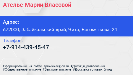 Ателье Марии Власовой по адресу 672000, Забайкальский край, Чита, Богомягкова, 24 в дальнейшем Организация, размещена в следующих категориях: