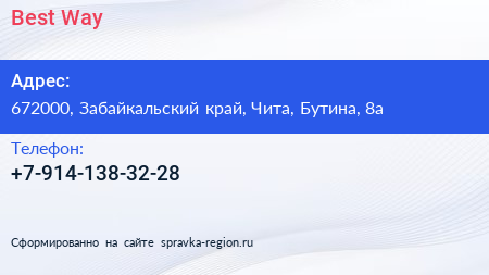 Best Way по адресу 672000, Забайкальский край, Чита, Бутина, 8а в дальнейшем Организация, размещена в следующих категориях: