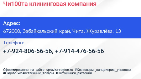 Чи100та, клининговая компания по адресу 672000, Забайкальский край, Чита, Журавлёва, 13 в дальнейшем Организация, размещена в следующих категориях: