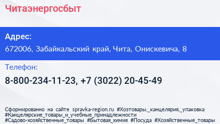 Читаэнергосбыт по адресу 672006, Забайкальский край, Чита, Онискевича, 8 в дальнейшем Организация, размещена в следующих категориях: