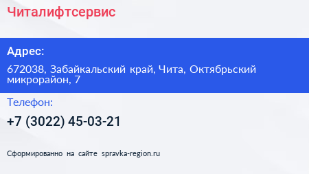 Читалифтсервис по адресу 672038, Забайкальский край, Чита, Октябрьский микрорайон, 7 в дальнейшем Организация, размещена в следующих категориях:
