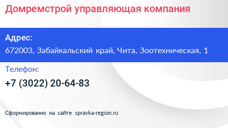 Домремстрой, управляющая компания по адресу 672003, Забайкальский край, Чита, Зоотехническая, 1 в дальнейшем Организация, размещена в следующих категориях: