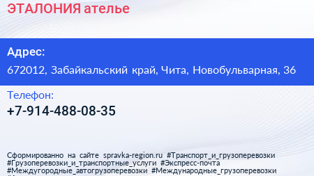 ЭТАЛОНИЯ, ателье по адресу 672012, Забайкальский край, Чита, Новобульварная, 36 в дальнейшем Организация, размещена в следующих категориях: