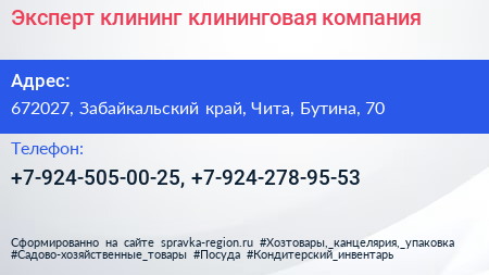 Эксперт клининг, клининговая компания по адресу 672027, Забайкальский край, Чита, Бутина, 70 в дальнейшем Организация, размещена в следующих категориях: