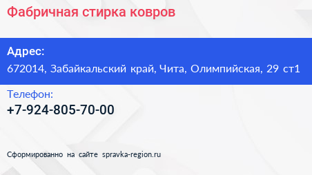 Фабричная стирка ковров по адресу 672014, Забайкальский край, Чита, Олимпийская, 29 ст1 в дальнейшем Организация, размещена в следующих категориях: