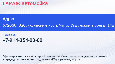 ГАРАЖ, автомойка по адресу 672030, Забайкальский край, Чита, Угданский проезд, 14д в дальнейшем Организация, размещена в следующих категориях: