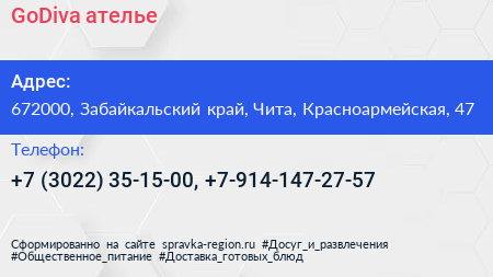 GoDiva, ателье по адресу 672000, Забайкальский край, Чита, Красноармейская, 47 в дальнейшем Организация, размещена в следующих категориях: