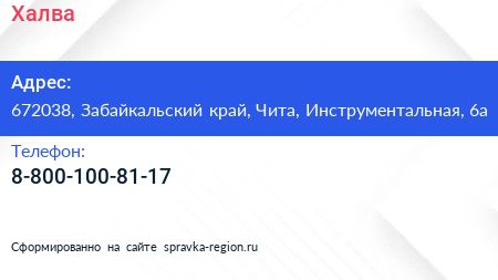 Халва по адресу 672038, Забайкальский край, Чита, Инструментальная, 6а в дальнейшем Организация, размещена в следующих категориях: