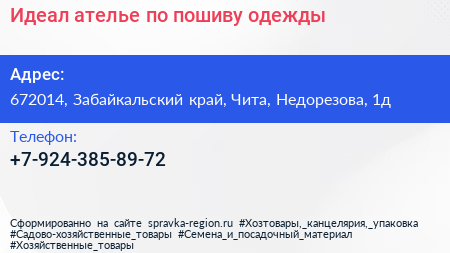 Идеал, ателье по пошиву одежды по адресу 672014, Забайкальский край, Чита, Недорезова, 1д в дальнейшем Организация, размещена в следующих категориях: