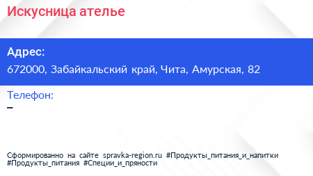 Искусница, ателье по адресу 672000, Забайкальский край, Чита, Амурская, 82 в дальнейшем Организация, размещена в следующих категориях: