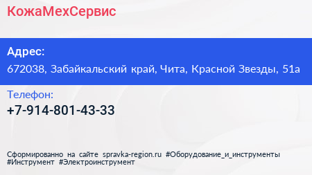КожаМехСервис по адресу 672038, Забайкальский край, Чита, Красной Звезды, 51а в дальнейшем Организация, размещена в следующих категориях: