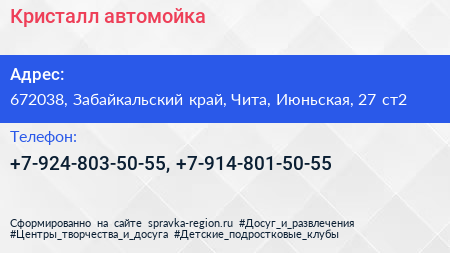 Кристалл, автомойка по адресу 672038, Забайкальский край, Чита, Июньская, 27 ст2 в дальнейшем Организация, размещена в следующих категориях: