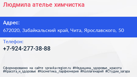 Людмила, ателье-химчистка по адресу 672020, Забайкальский край, Чита, Ярославского, 50 в дальнейшем Организация, размещена в следующих категориях: