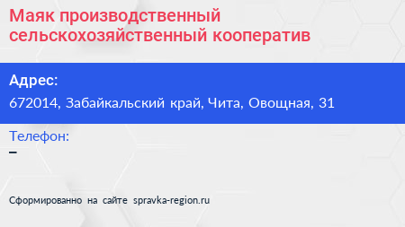 Маяк, производственный сельскохозяйственный кооператив по адресу 672014, Забайкальский край, Чита, Овощная, 31 в дальнейшем Организация, размещена в следующих категориях: