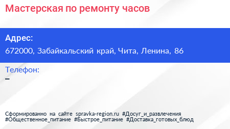 Мастерская по ремонту часов по адресу 672000, Забайкальский край, Чита, Ленина, 86 в дальнейшем Организация, размещена в следующих категориях:
