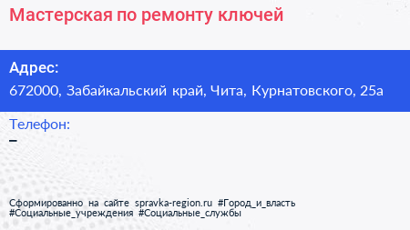 Мастерская по ремонту ключей по адресу 672000, Забайкальский край, Чита, Курнатовского, 25а в дальнейшем Организация, размещена в следующих категориях: