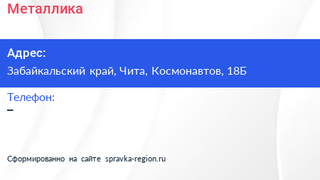 Металлика по адресу Забайкальский край, Чита, Космонавтов, 18Б в дальнейшем Организация, размещена в следующих категориях: