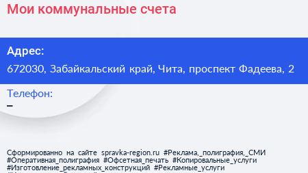Мои коммунальные счета по адресу 672030, Забайкальский край, Чита, проспект Фадеева, 2 в дальнейшем Организация, размещена в следующих категориях: