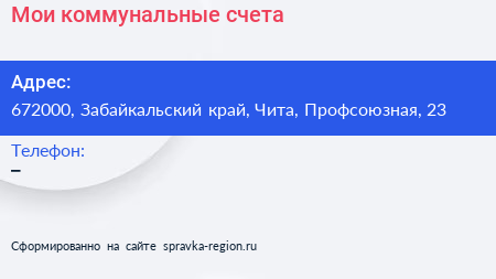 Мои коммунальные счета по адресу 672000, Забайкальский край, Чита, Профсоюзная, 23 в дальнейшем Организация, размещена в следующих категориях: