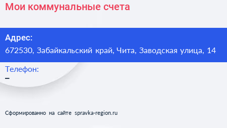 Мои коммунальные счета по адресу 672530, Забайкальский край, Чита, Заводская улица, 14 в дальнейшем Организация, размещена в следующих категориях: