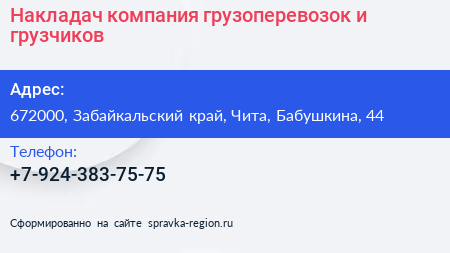 Накладач, компания грузоперевозок и грузчиков по адресу 672000, Забайкальский край, Чита, Бабушкина, 44 в дальнейшем Организация, размещена в следующих категориях: