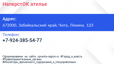 НаперстОК, ателье по адресу 672000, Забайкальский край, Чита, Ленина, 123 в дальнейшем Организация, размещена в следующих категориях: