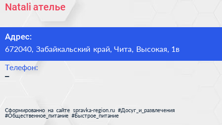 Natali, ателье по адресу 672040, Забайкальский край, Чита, Высокая, 1в в дальнейшем Организация, размещена в следующих категориях:
