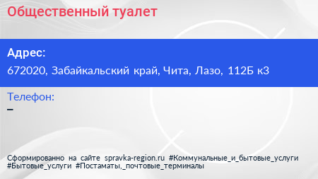 Общественный туалет по адресу 672020, Забайкальский край, Чита, Лазо, 112Б к3 в дальнейшем Организация, размещена в следующих категориях: