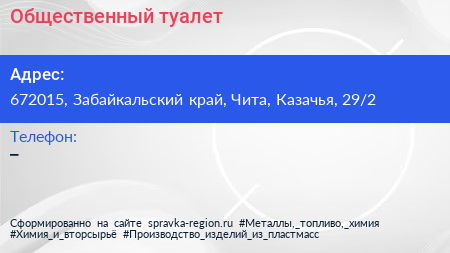 Общественный туалет по адресу 672015, Забайкальский край, Чита, Казачья, 29/2 в дальнейшем Организация, размещена в следующих категориях: