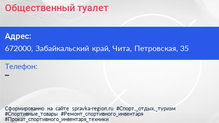 Общественный туалет по адресу 672000, Забайкальский край, Чита, Петровская, 35 в дальнейшем Организация, размещена в следующих категориях: