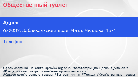 Общественный туалет по адресу 672039, Забайкальский край, Чита, Чкалова, 1а/1 в дальнейшем Организация, размещена в следующих категориях: