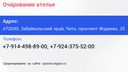 Очарование, ателье по адресу 672030, Забайкальский край, Чита, проспект Фадеева, 35 в дальнейшем Организация, размещена в следующих категориях: