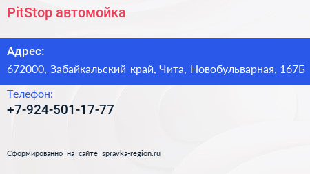 PitStop, автомойка по адресу 672000, Забайкальский край, Чита, Новобульварная, 167Б в дальнейшем Организация, размещена в следующих категориях: