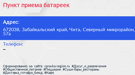 Пункт приема батареек по адресу 672038, Забайкальский край, Чита, Северный микрорайон, 57а в дальнейшем Организация, размещена в следующих категориях: