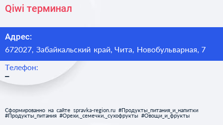 Qiwi, терминал по адресу 672027, Забайкальский край, Чита, Новобульварная, 7 в дальнейшем Организация, размещена в следующих категориях: