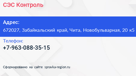 СЭС Контроль по адресу 672027, Забайкальский край, Чита, Новобульварная, 20 к5 в дальнейшем Организация, размещена в следующих категориях: