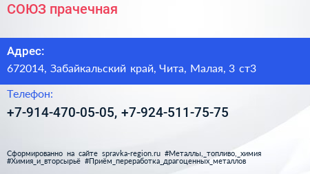 СОЮЗ, прачечная по адресу 672014, Забайкальский край, Чита, Малая, 3 ст3 в дальнейшем Организация, размещена в следующих категориях:
