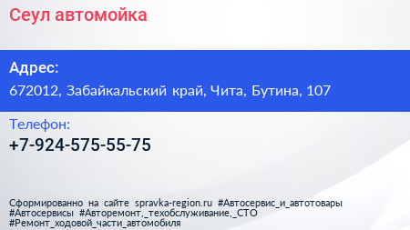 Сеул, автомойка по адресу 672012, Забайкальский край, Чита, Бутина, 107 в дальнейшем Организация, размещена в следующих категориях: