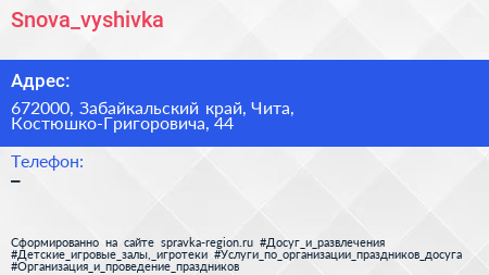 Snova_vyshivka по адресу 672000, Забайкальский край, Чита, Костюшко-Григоровича, 44 в дальнейшем Организация, размещена в следующих категориях: